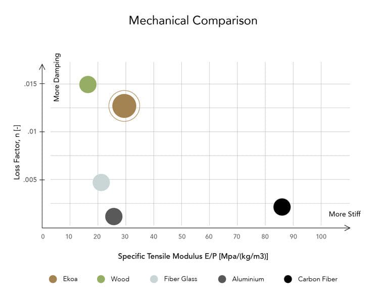 Ekoa® has outstanding damping properties for an engineering material with a unique stiffness-damping combination. With 20-30 % higher specific stiffness than fiberglass, Ekoa® composites exhibit three times higher damping than carbon and fiberglass.