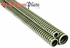 DragonPlate all-braided Carbon/Kevlar tube is a hybrid component that trades off much of the stiffness of the carbon fiber for the aesthetics of a carbon/Kevlar blend. Comprising 50% carbon fiber and 50% Kevlar both evenly distributed, this tube provides a lightweight solution to achieve the look of carbon/Kevlar braid. The standard braided tube or twill roll-wrapped tube with carbon/Kevlar face ply are recommended if the carbon/Kevlar look is desired, but greater rigidity and strength are required.